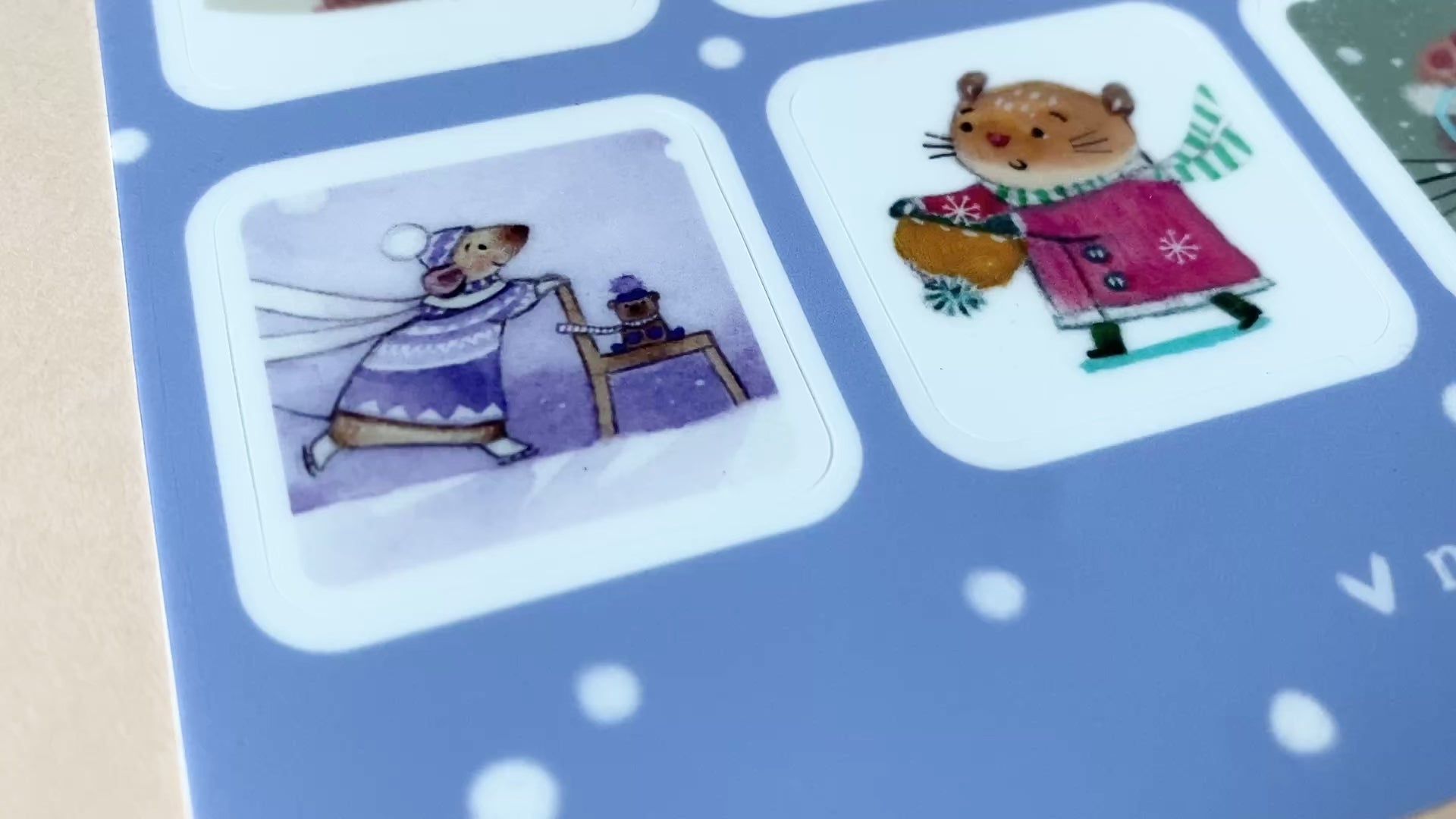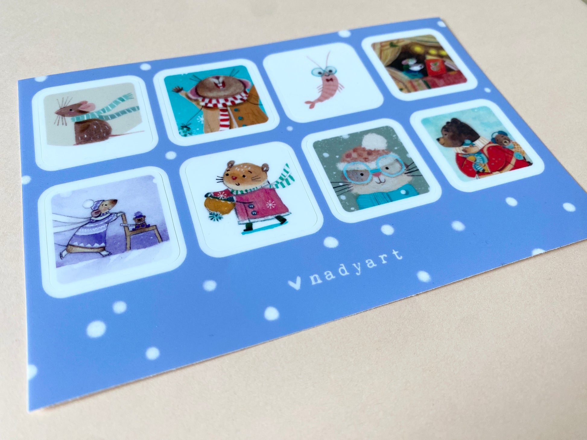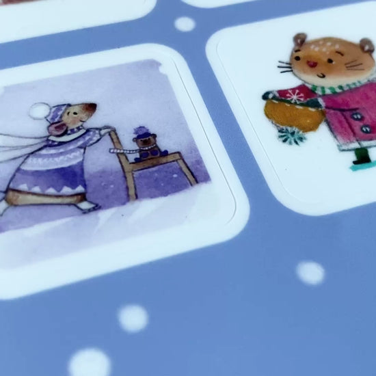 The sticker sheet is water-proof and contains 8 high-quality Winter themed stickers picturing cute characters in cozy winter scenes.
