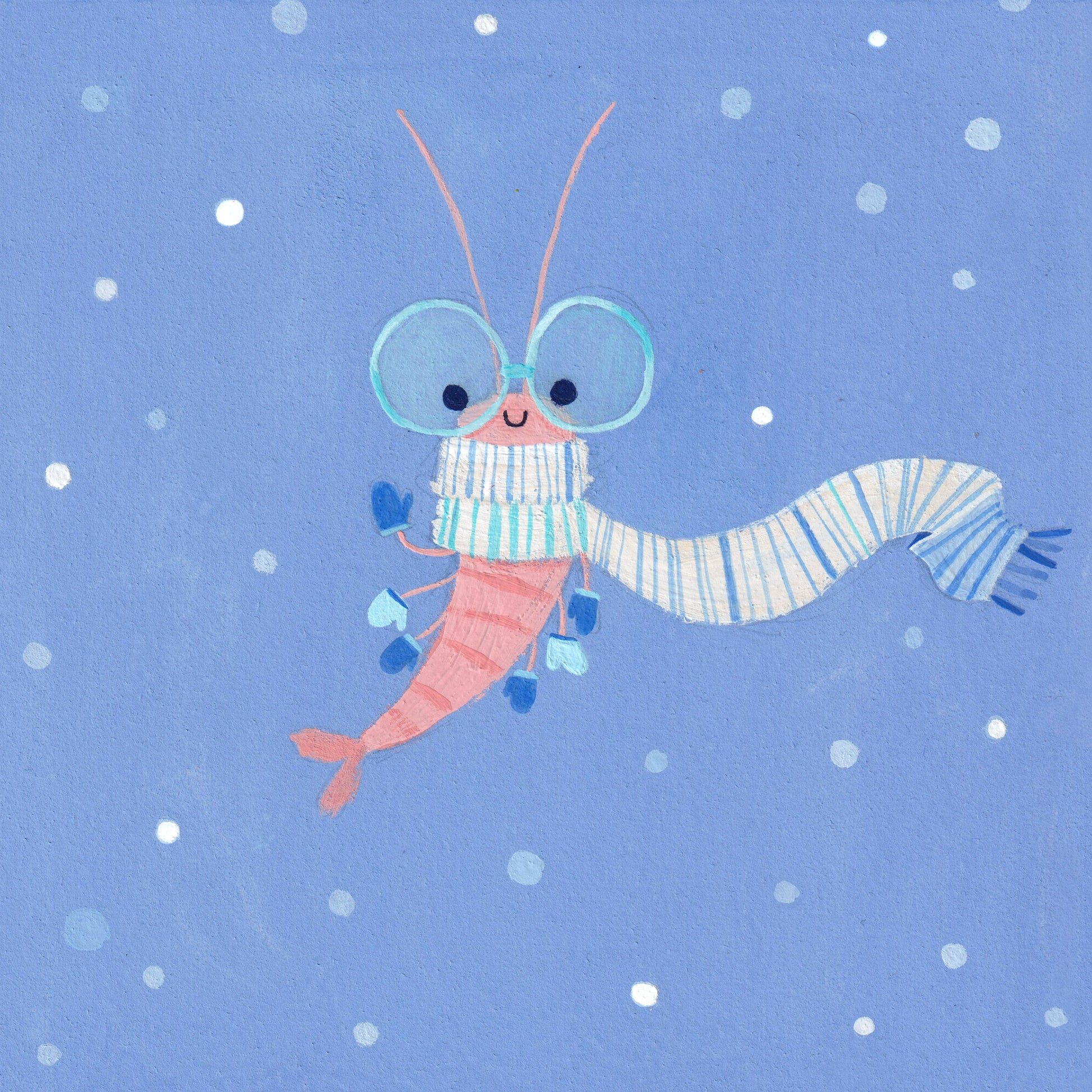 Max the Shrimp is cozying up for Winter, and so will you when you receive this cute and vibrant image of Max wearing a scarf and six cute mittens!